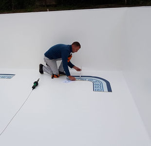 A questa nuova piscina è stato dato un grande look shabby con un logo 3D. Abbinato ad esso c'è un coprirullo stampato traslucido di pooldesign.
