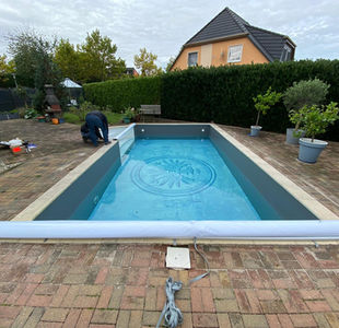 Una piscina bianca nuova di zecca ha un design discreto e senza tempo grazie al nostro sistema modulare. I singoli elementi sono stati adattati alla forma della piscina.